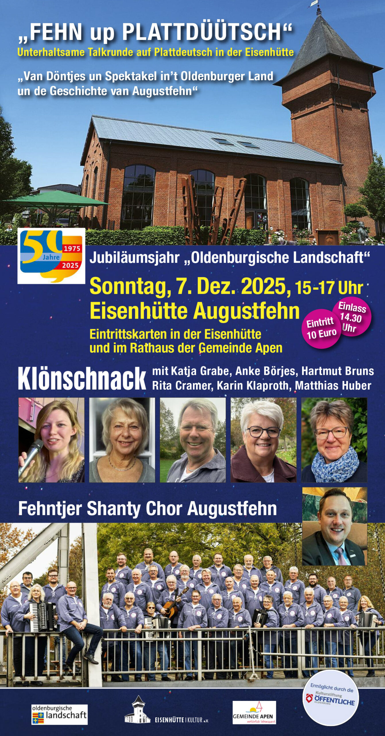 Den Anlass für die Veranstaltung geben in diesem Jahr gleich zwei Jubiläen: 50 Jahre Oldenburgische Landschaft und 175 Jahre Ortschaft Augustfehn – zwei besondere Gründe, um gemeinsam zu feiern und plattdeutsche Kultur lebendig werden zu lassen.