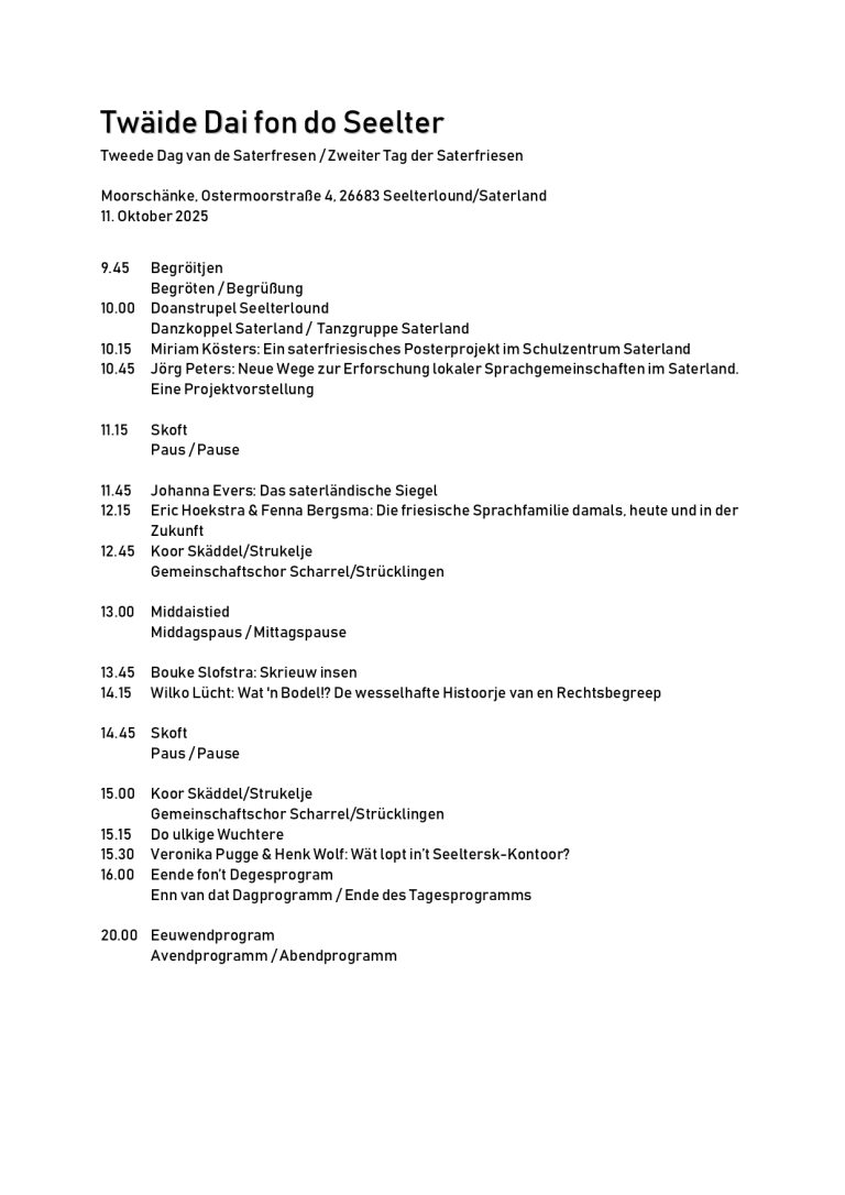Was erfährt eine Sprachforscherin, wenn sie sich mit dem Saterfriesischen befasst? Und was passiert eigentlich in einer Saterfriesisch-AG in der Schule? Diese und weitere Fragen zur kleinsten Sprache Europas werden am 11. Oktober beim zweiten Tag des Saterfriesischen in Ramsloh beantwortet. In der Moorschänke in Ramsloh berichten neun Fachleute über ihre Arbeit. Das Programm wird musikalisch umrahmt von Musik- und Tanzgruppen aus dem Saterland.
